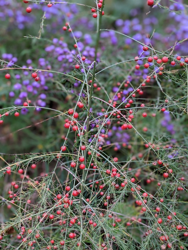 Decorative red asparagus seeds. Another great plant that is both visually beautiful, tasty and a favorite of pollinators.