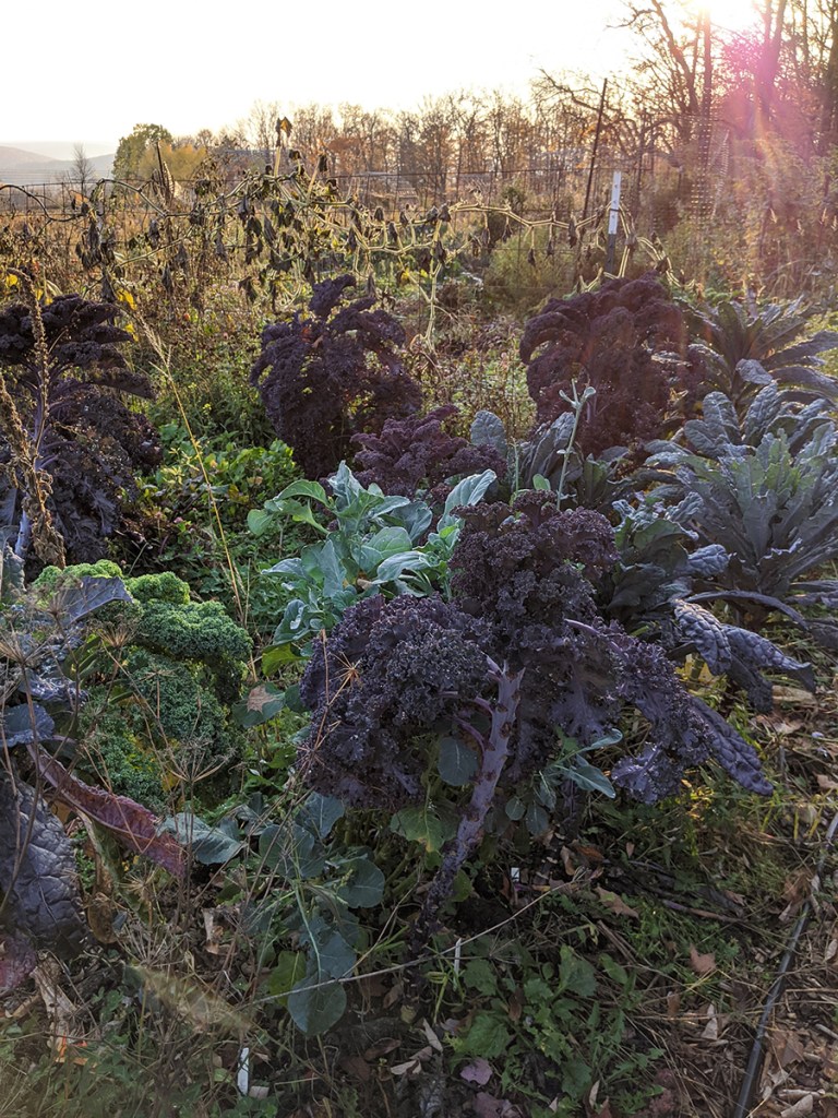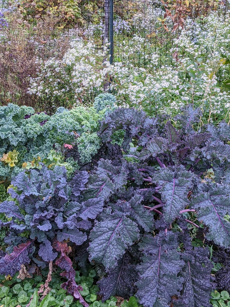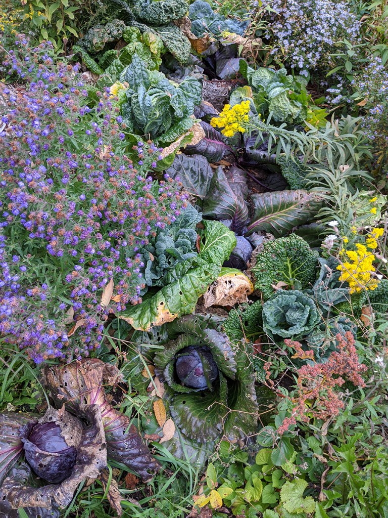 Red and Savoy cabbages, a little smaller than normal due to the drought but still decorative even after the frost.