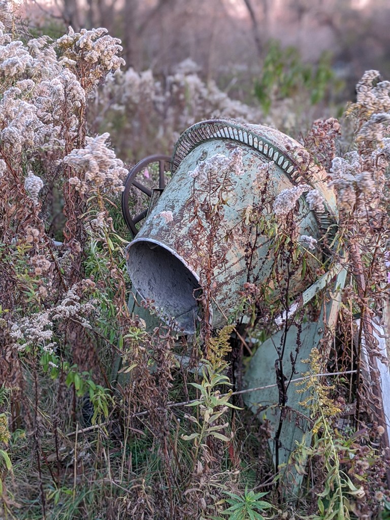 Dried up cup plant stacks ready for kindling and a blue chicory flower making its last splash before winter.
