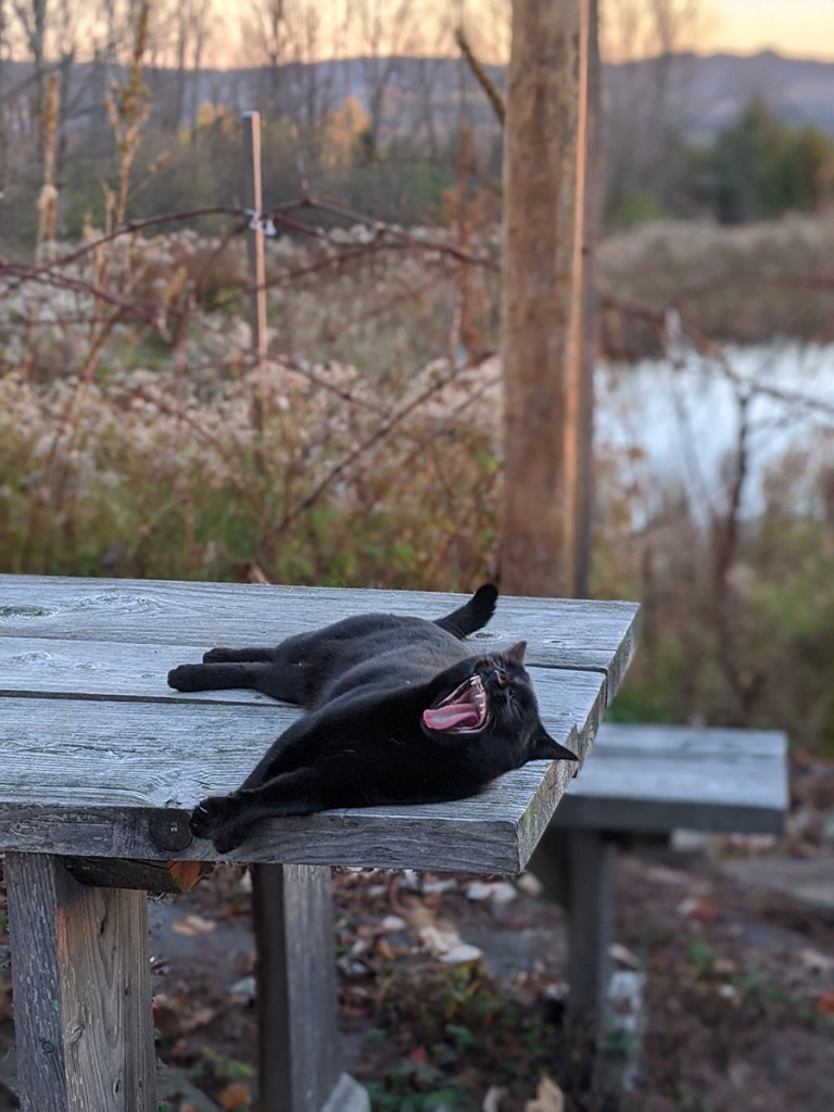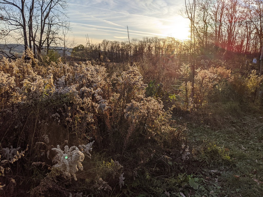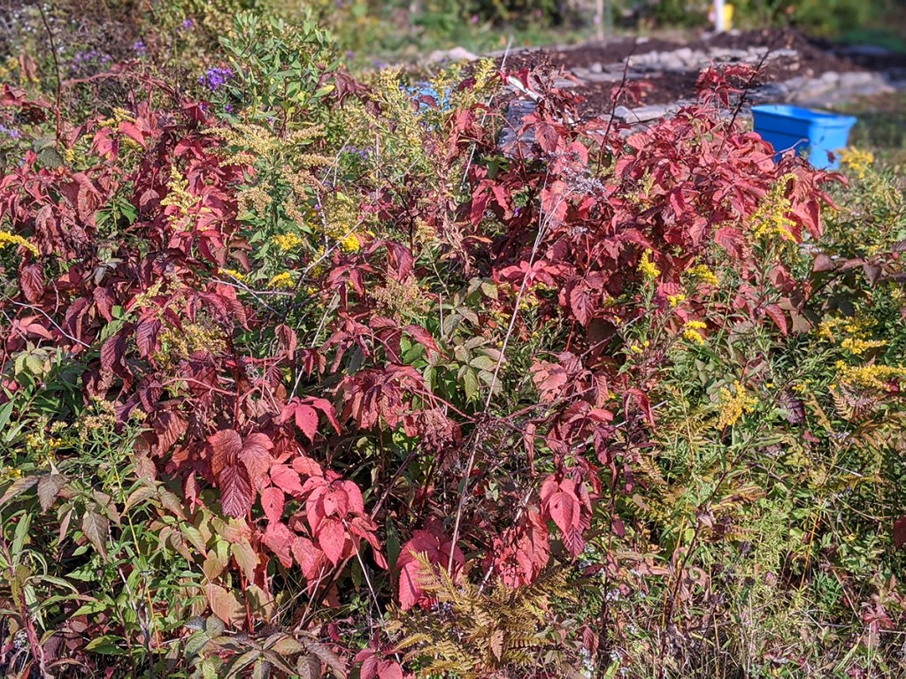 Wild blackberry electric fall foliage with new saffron beds in background.