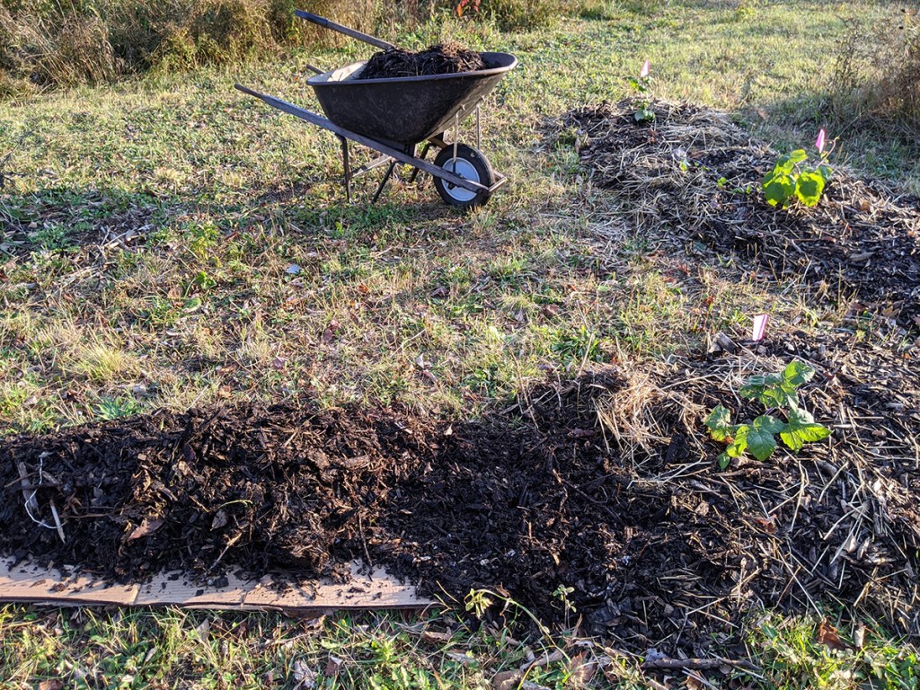 Making new black raspberry beds with cardboard, woodchip, a little of our good compost and of course the newly propagated black raspberry plants. We tip root black raspberries as soon as they are done fruiting into planting pots with a rock on top and about a month or two later it is all root ready to be cut and planted out. Both black and red raspberries have become our favorite berries, they are visually beautiful, produce loads of berries. In our experience they are easy too. Just give them some mulch and a little compost or aerated compost tea and they thrive even through droughts.