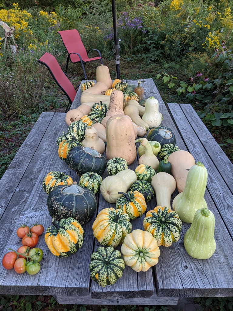 Winter squashes harvested before the frost though many were hiding in the weeds and made it through even the 2nd round of frost.