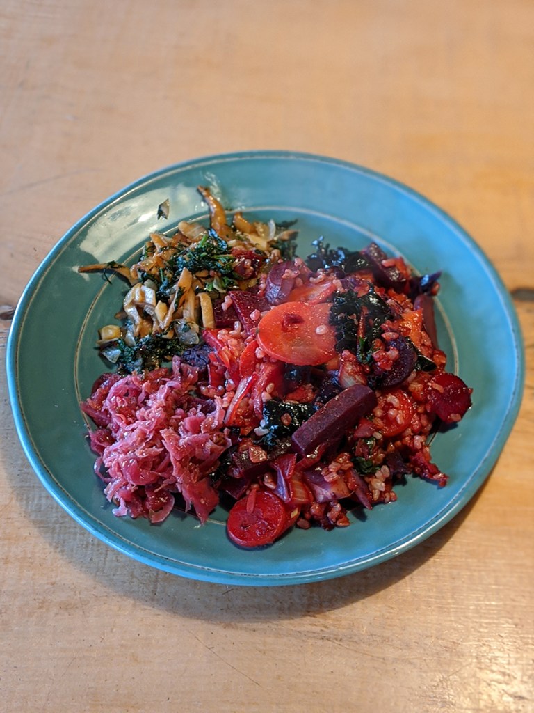 Sautéed oyster mushroom with garlic, onion and carrot top. Sweet carrot, beet, daikon, red cabbage and kale sautéed with brown rice and pink ginger curry sauerkraut.