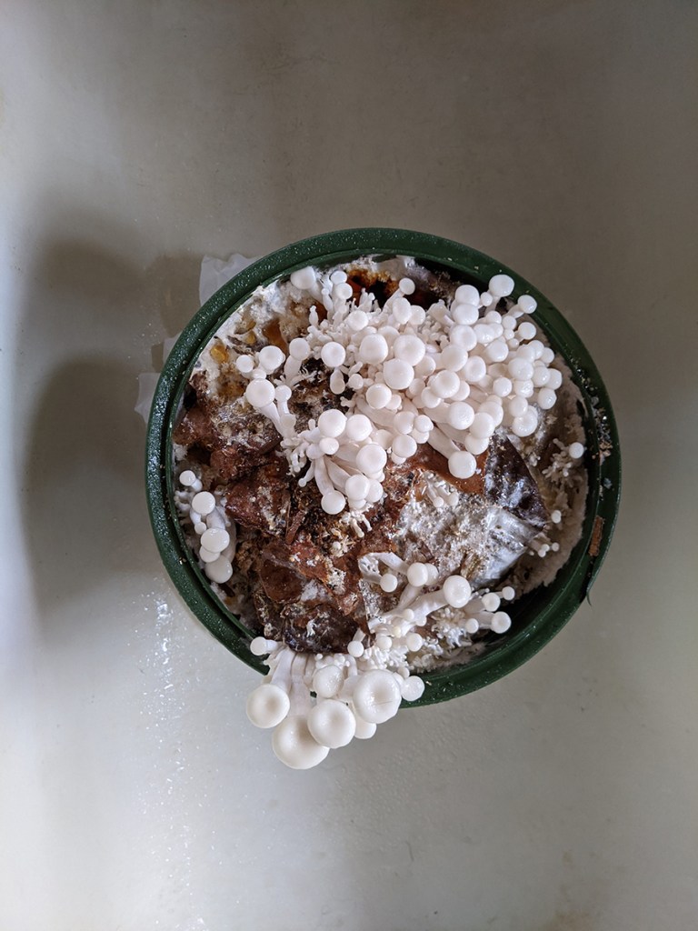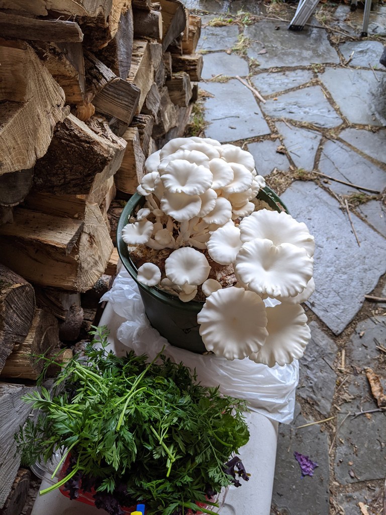 White oyster mushroom spawn inoculated into shredded cardboard and layered into a recycled plastic planter pot. For inoculation I put the white plastic bag over the top and after a few weeks when I peeked it looked like this. I decided to try to top fruit the oysters in our shower tub since it is a little too cold outside and that way I can keep an eye on the daily growth. I spray water with a small spray bottle a few times a day for moisture.
